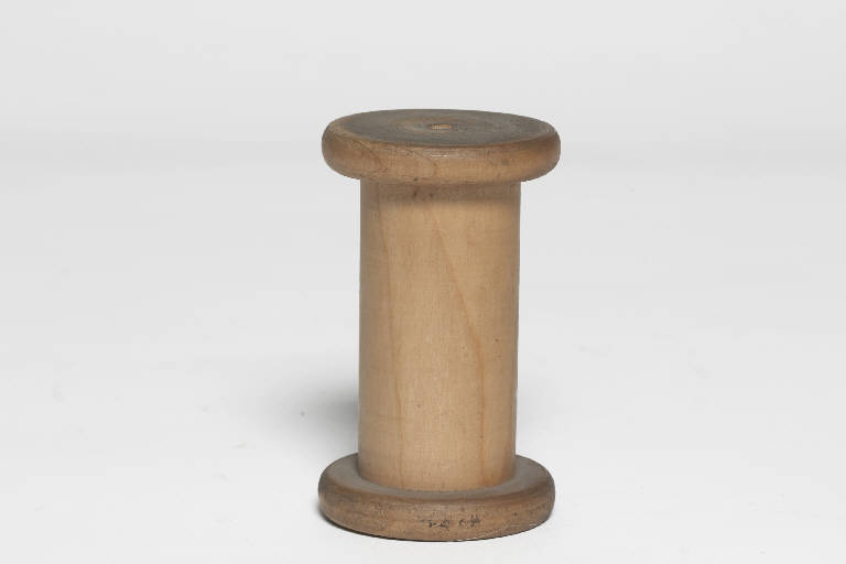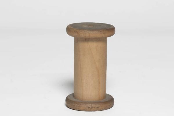 Rocchetto interamente in legno, con anima molto grossa e piccole flange, realizzato per tornitura in un pezzo solo. Possiede un canale passante lungo l'asse, per il posizionamento sul fuso del filatoio. I 15 oggetti della serie sono singolarmente contrassegnati con lettere da A a Q