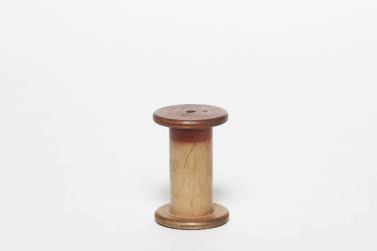 Rocchetto interamente in legno, con anima molto grossa e piccole flange, realizzato per tornitura in un pezzo solo. Possiede un canale passante lungo l'asse, per il posizionamento sul fuso del filatoio. I rocchetti sono contenuti in tre scatole A: Kg 6; B: Kg 10; C: Kg 8.