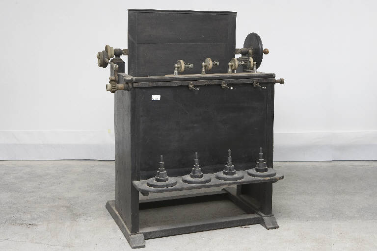 La macchina ha struttura in legno verniciato di nero. Davanti, Nella parte anteriore, in basso, un pianetto con 4 portarocche e poco sopra ciascuno di essi, in successione: un passafilo metallico, una stribbia a molla foderata con dischetti di feltro, la tavola nera sula quale va ad avvolgersi il filo. Il movimento di avvolgimento è impartito manualmente