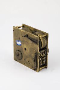 Struttura di ottone con rari elementi di ferro. Platine anteriore e posteriore quadrate raccordate da colonnine angolari a balaustro. La platina posteriore riporta scritta a incisione il cui tratto si prolunga a formare fregio diffuso sull'intera superficie. Piastra verticale avvitata su uno dei lati, lavorata con il medesimo disegno a traforo e incisione che caratterizza gli elementi della platina. Quadrante e indicazione delle ore mancanti. Scappamento a verga regolato da bilanciere. Bariletti fissi. Bariletto del tempo decorato con elemento a fiore inciso, inscritto entro cornice a rettangolo. Suoneria delle ore in 12 con ruota partitora. Suoneria su campana. Martelletto inciso e traforato, con motivo di animale fantastico e rameggio, su asta fissata su lamina traforata e incisa posizionata a contatto con platina. Regolazione della suoneria su quadrante circolare dentellato con elemento floreale centrale inciso, e numerazione esterna entro ghiera. Carica a chiavetta.