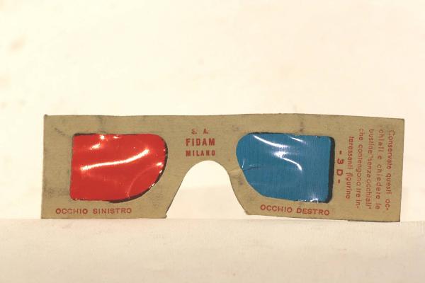 Occhiali con montatura in cartoncino, senza stanghette laterali, di forma squadrata. Le lenti sono costituite da un film trasparente di colore rosso (sinistra) e uno di colore blu (destra).