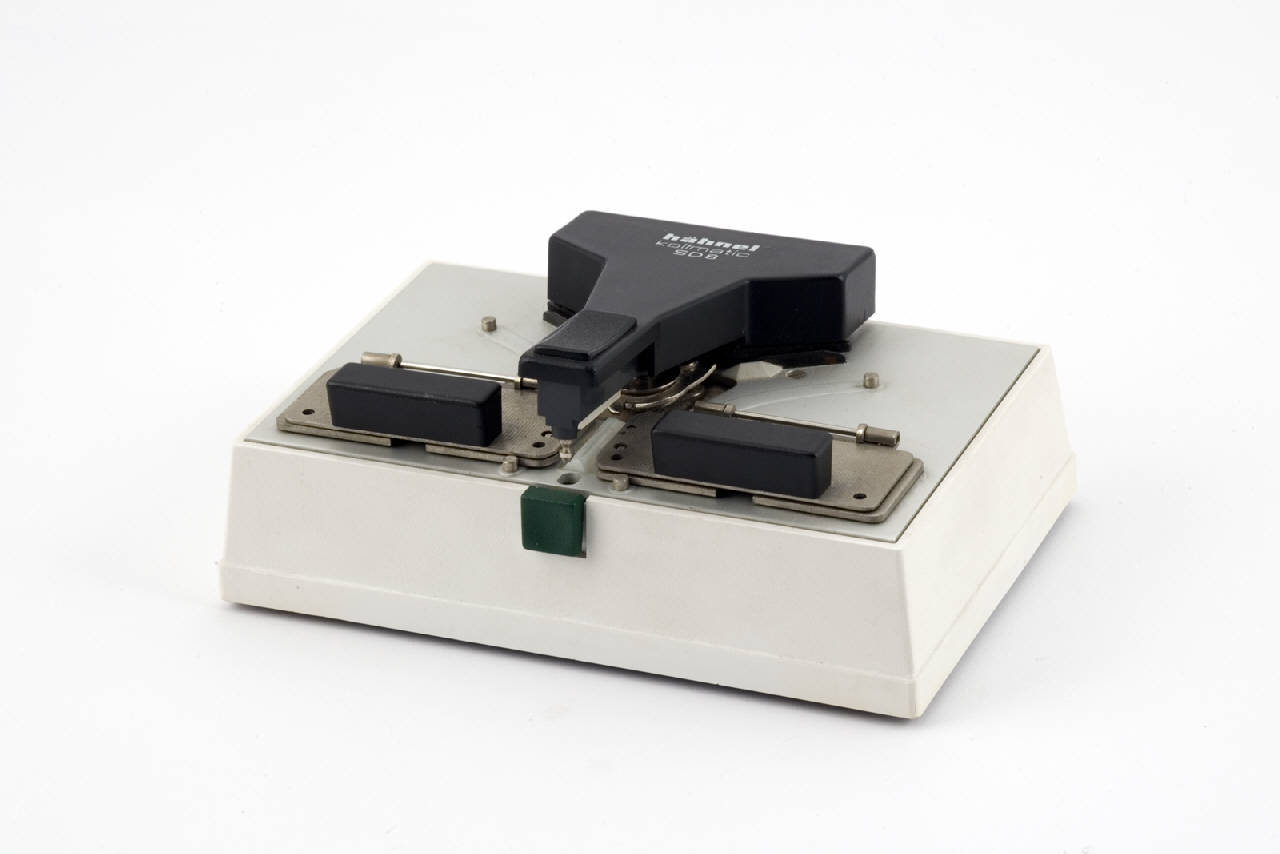 Dispositivo costituito da una base di forma rettangolare in plastica con una placca in metallo nella parte superiore. Su questa placca è inserito un perno costituito da un'asta in plastica e metallo vincolata ad un'estremità e che termina, dall'altra parte, con una lamina in plastica e un incastro per il fissaggio alla base. L'incastro viene liberato agendo su un pulsante verde posto anteriormente. Al centro della placca è iserita una taglierina costituita da un disco in metallo con profili affilati. Ai lati si hanno due coppie di alette in metallo con piccole impugnature in plastica nera che permettono di sollevare le alette superiori. Tra le due alette sono inseriti i dentini di metallo (chiodetti di guida) da utilizzare per posizionare correttamente la pellicola da 8mm o 16mm (fori della pellicola nei chiodati corrispondenti). Ciascuna delle due coppie di alette è imperniata dalla parte esterna e può ruotare posizionando così la parte contenente la pellicola da tagliare in corrispondenza dell'elemento tagliente. Questo disco tagliente può spostarsi lateralmente per facilitare l'ingresso della pellicola.