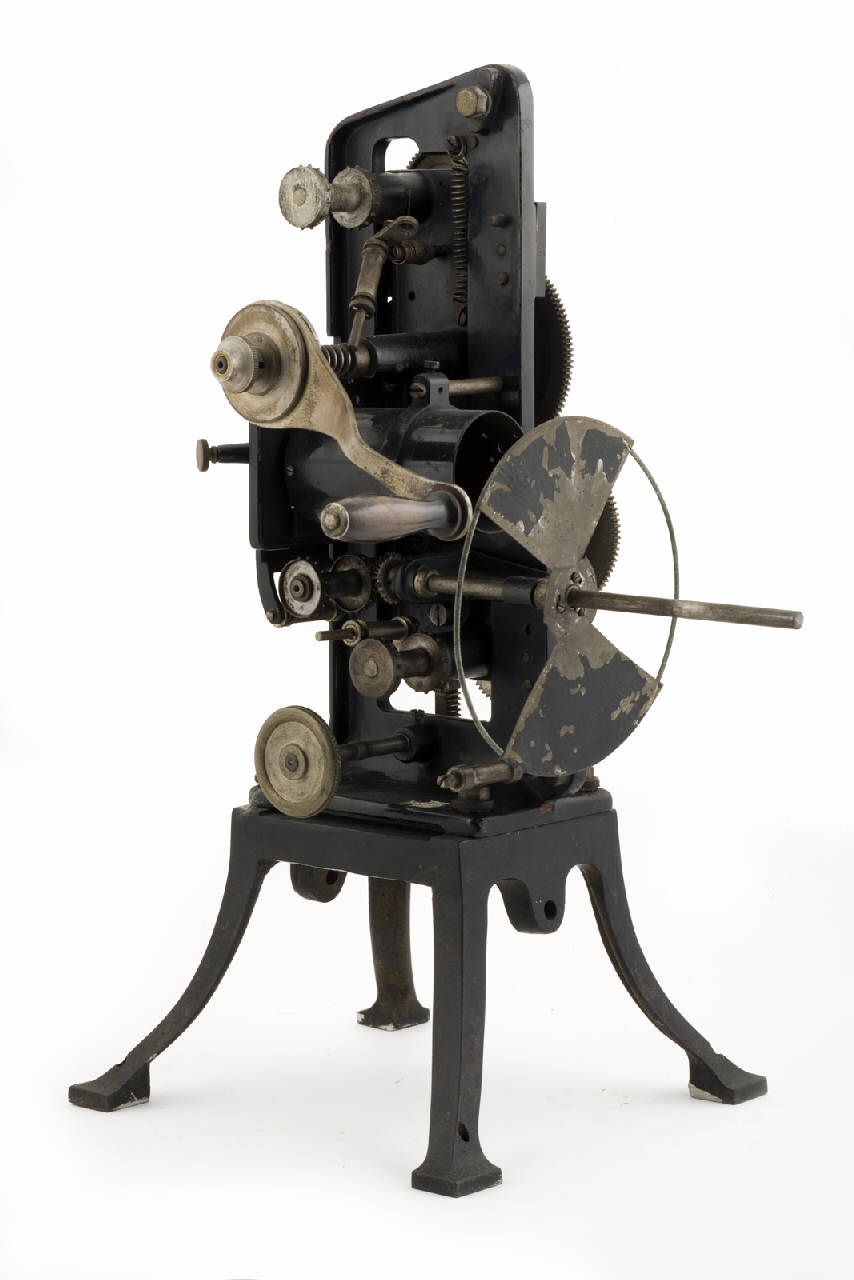 Proiettore cinematografico da tavolo in metallo, a sviluppo verticale. E' presente la struttura complessiva ma mancano l'obiettivo, il dispositivo illuminante, i bracci in cui si inseriscono le bobine.\nSu un montante in metallo verniciato di nero, sono fissati, da un lato, i dispositivi di trascinamento della pellicola, la manovella e il porta obiettivo, dall'altro, quattro ruote dentate collegate con la manovella e una croce di Malta. La base del montante è fissata ad un piano d'appoggio in metallo con quattro gambe. Al montante e alla base si fissavano anche i bracci per le bobine.\nI dispositivi di trascinamento sono costituiti da cilindri sia lisci che con dentini sporgenti sui bordi e guide per la pellicola che servivano anche per tenerla nella giusta tensione. Tra i cilindri si inserisce un porta obiettivo. L'obiettivo è mancante.\nDietro all'obiettivo si ha un telaio nel quale si trova la guida verticale per lo scorrimento della pellicola 35mm. Questo telaio presenta una riquadro rettangolare in corrispondenza del punto in cui si posiziona il fotogramma che viene proiettato. All'altezza di questo riquadro si posizionava l'apparato illuminante, ora mancante. Sopra all'obiettivo si ha un cilindro in cui si inserisce la manovella collegata con le ruote dentate dall'altra parte del montante. Davanti all'obiettivo è inserito un otturatore a farfalla che ruota al ruotare della manovella.\nMentre il porta obiettivo è fisso sul montante, il resto del proiettore può scorrere verso l'alto o verso il basso, agendo su un'apposita ruota.