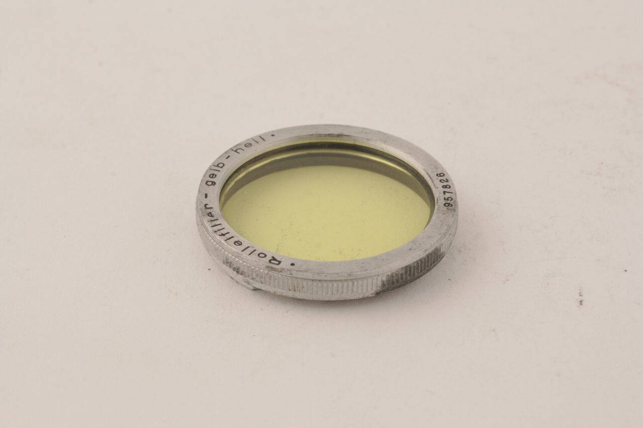 Filtro fotografico di forma circolare con lente giallo chiaro montata su telaio in metallo.\nInserzione a baionetta davanti all'obiettivo\nIl filtro è conservato in una custodia in cuoio marrone con chiusura a bottone.