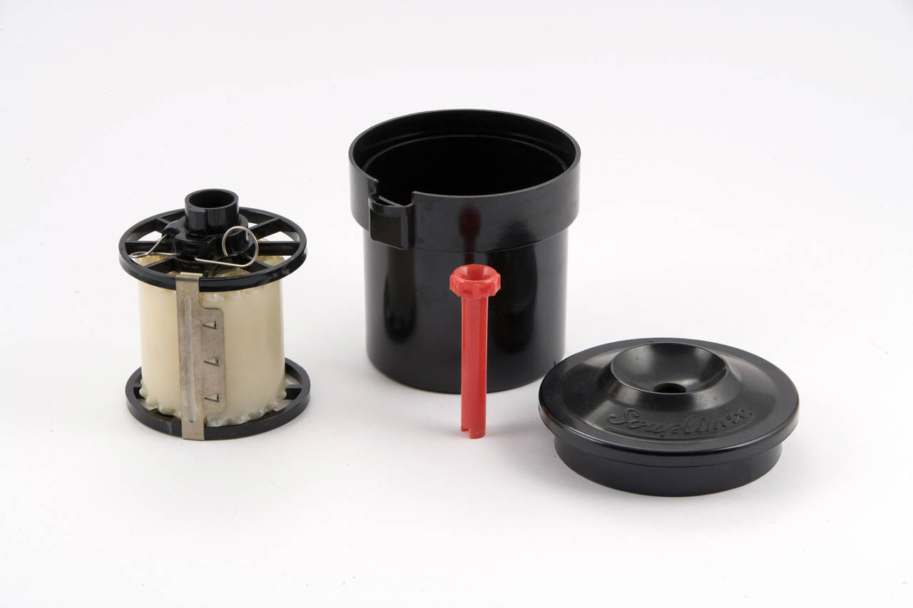 Bacinella cilindrica in materiale plastico nero resistente agli acidi chiusa da un coperchio dello stesso materiale e con un beccuccio laterale. Al centro del coperchio è presente un piccolo imbuto nel quale è inserito un tubo rosso probabilmente per l'inserimento di un termometro e per versare il liquido di sviluppo all'interno della sviluppatrice.\nAprendo la bacinella, inserita a pressione nel coperchio, si ha la bobina per pellicole per formati 6x9cm. Sul cilindro della bobina è avvolto un nastro in materiale plastico lungo il quale si posiziona la pellicola. Una molletta in metallo permette di fissare la bobina nella posizione desiderata.\nTutta la sviluppatrice è contenuta in una scatola in cartone recante il nome del dispositivo, il marchio ed alcune informazioni.