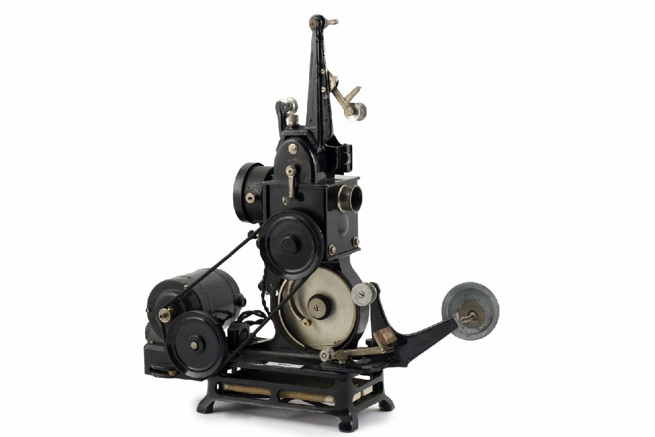Proiettore cinematografico in metallo, a sviluppo verticale. E' costituito sostanzialmente da una base con quattro piedini, un motorino elettrico, l'apparato illuminante, il dispositivo di proiezione, le aste porta bobine.\nIl motorino elettrico è fissato alla base con appositi incastri, ha una presa per il collegamento all'alimentazione esterna, una spina per il collegamento al proiettore, un interruttore di accensione e un reostato per la variazione dell'intensità di corrente erogata al proiettore (il proiettore funziona con tensioni da 110V).\nAlla base è fissata una struttura verticale in metallo al centro della quale si trova il dispositivo di proiezione costituito da una lente e un otturatore rotante collegato mediante una puleggia e una cinghia al motorino. Sopra è inserito un braccio in metallo sul quale si inserisce una delle due bobine (quella con la pellicola da proiettare, attualmente mancante) e i rocchetti cilindrici che guidano la pellicola nel suo moto attraverso il proiettore. L'altra bobina (quella che riceve la pellicola già proiettata, anch'essa mancante) è inserita, mediante un apposito telaio in metallo, direttamente nella base, dalla parte opposta rispetto al motorino.\nDietro alla lente del dispositivo di proiezione, si inserisce l'apparato illuminante costituito da una lampadina a filamento a basso voltaggio con resistore fisso, uno specchio concavo e una lente condensatrice, collocati in posizione opposta rispetto alla lampada e inseriti in un contenitore cilindrico collegato elettricamente alla base. Questo cilindro è vincolato nella parte bassa ma apribile a compasso per permettere il posizionamento della guida film, un telaietto rettangolare posto tra condensatore e lente di proiezione che costituisce la guida per lo scorrimento della pellicola 9,5mm. Questo telaietto presenta una riquadro rettangolare in corrispondenza del punto in cui si posiziona il fotogramma che viene proiettato.\nSul telaio, sotto all'apparato illuminante, è presente un vano circolare, chiuso da un vetro, nel quale si raccoglieva la pellicola proiettata se non era disponibile la bobina ricevitrice.\nIn questo caso la pellicola da proiettare era inserita in un apposito vano posto nella parte alta del proiettore.