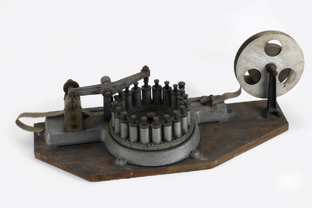 Su una base in legno è fissata una base in metallo con al centro un disco rotante con 20 punzoni disposti lungo il bordo. Nella parte inferiore i punzoni terminano con punte di diverso diametro. Da un lato del disco è presente un dispositivo a manovella con un'asta che termina con un piccolo martello che agisce sui singoli stantuffi. Dall'altro lato è fissata un'asta sulla quale è disposta una bobina per la carta da perforare. La carta scorreva lungo una guida longitudinale che attraversa tutta la punzonatrice.