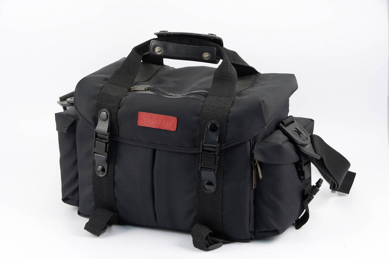 Borsa da fotografo in materiale imbottito antiurto.\nE' costituita da un grosso vano centrale suddiviso in più scomparti separati da divisori spostabili e da tre tasche esterne.\nCiascuna parte è chiusa da cerniere e/0 dispositivi in plastica a incastro. La zona centrale più grande è protetta da un coperchio chiuso con due dispositivi a incastro.\nSopra è inserita una maniglia e lateralmente una tracolla per il trasporto.