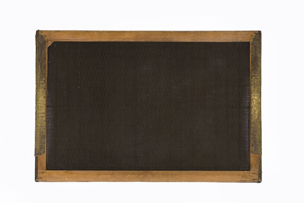 Telaio rettangolare in legno sul quale è fissata una rete in fili di metallo molto sottili che formano la tela filigranatrice. Su questa rete, che funge da setaccio, sono ricamati con un altro filo metallico disegni geometrici tipo onde doppie che realizzano una filigrana in chiaroscuro. Sul telaio è appoggiata una cornice in legno con rinforzo in ottone (cascio).\nIl retro della forma è rinforzato con astine in legno.