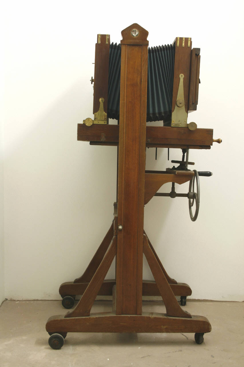Apparecchio fotografico montato su cavalletto da studio, entrambi prevalentemente realizzati in legno.\nL'apparecchio è costituito da due telai in legno collegati da un soffietto in cartone ricoperto in tessuto. Il telaio posteriore termina con una guida nella quale si inseriscono due porta lastre in legno con serranda e coperchio in legno. All'interno dei portalastra si ha una cornice per l'inserimento della lastra fotografica di formato 7x9cm. Al centro del telaio anteriore si ha un portaobiettivo in legno ad altezza regolabile (l'ottica è mancante), all'interno del telaio si ha un otturatore a lamelle azionato dall'esterno mediante una piccola manopola.\nI due telai sono fissati ad una base in legno divisa in due parti e possono scorrere lungo due cremagliere agendo su due rotelle poste lateralmente. In questo modo viene modificata la lunghezza del soffietto e ottenuta la messa a fuoco. Una manopola posta anteriormente governa un meccanismo con vite senza fine che muove le due parti della base.\nL'apparecchio fotografico è inserito in un cavalletto in legno costituito da un montante verticale e due gambe laterali triangolari.\nAgendo su due ruote poste anteriormente è possibile modificare l'inclinazione dell'apparecchio fotografico e la posizione verticale.\nIl cavalletto termina con quattro piccole ruote per facilitarne lo spostamento.
