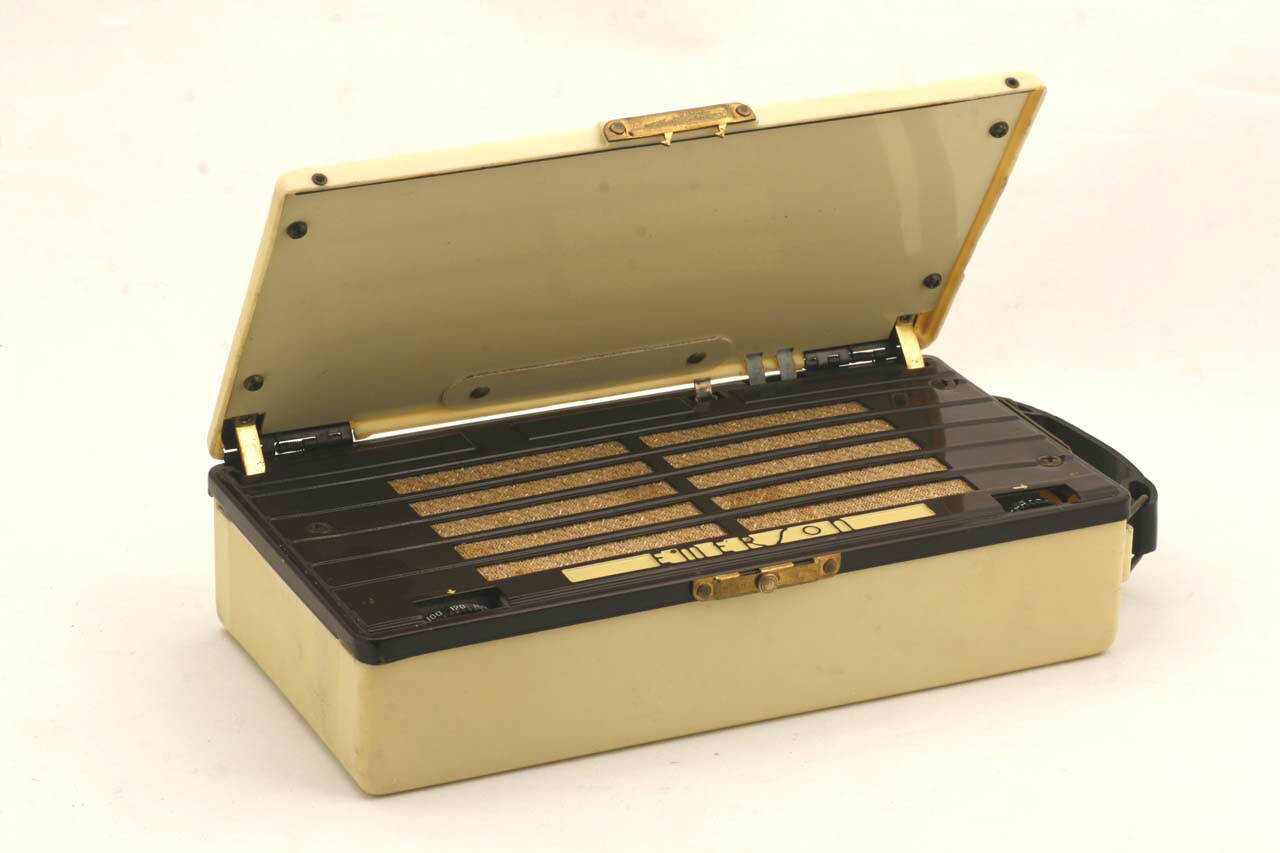 Apparecchio realizzato a forma di cofanetto, costituito da due parti, coperchio e radio, legate assieme da un sistema di cerniere collegate a due meccanismi a scatto per l'apertura. Su un lato è posta una maniglia in gomma morbida nera.\nE' realizzata in materiale plastico a due colori: bianco panna all'esterno e in parte all'interno, e marrone scuro all'interno per la parte contenente i comandi e l'altoparlante.\nL'altoparlante occupa gran parte della superficie interna ed è ricoperto da una griglia in plastica e del tessuto ruvido. In basso si hanno due rotelle di regolazione, parzialmente incassate nell'involucro in plastica, per l'accensione e la regolazione del volume e per la sintonia. La scala di sintonia e' di tipo numerico.\nAll'interno si ha il circuito supereterodina di funzionamento con quattro in miniatura "tuttovetro".\nNello spessore della base si trovano le batterie di alimentazione, mentre nel coperchio è contenuta l'antenna a telaio.