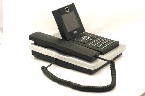 Apparecchio fisso a filo in plastica color argento metallizzato e canna di fucile opaco. \nSul lato sinistro della base poggia, in un apposito vano, il microtelefono nero, collegato alla base con un cavo a spirale in plastica morbida nera. Il microtelefono racchiude il trasmettitore e il ricevitore, uniti da una parte centrale che funge da impugnatura ergonomica e si incorpora perfettamente, quando riposta, nella base dell'apparecchio. Nel vano è presente il tasto di interruzione linea con funzioni di forcella.\nSul lato destro si hanno un display TFT-LCD digitale grafico retroilluminato a 65.536 colori con video-fotocamera integrata che può essere sistemato in posizione obliqua, una tastiera alfanumerica per la digitazione del numero telefonico ed una tastiera con i comandi d'uso. La tastiera alfanumerica comprende i tasti con le cifre da 0 a 9 e le lettere dell'alfabeto e i tasti di funzione * e #. I tasti di funzione sono: "Tasto impegno linea / Vivavoce", "Tasto rilascio linea / ritorno al menu precedente", "Tasti di navigazione" per scorrere le voci del Menu, "Tasto RP", "Tasto diretto servizio Segreteria", "Tasto diretto servizio Ultime Chiamate", "Tasto di accesso diretto alla Rubrica", "Tasto funzione sinistro", "Tasto funzione destro", "Tasto VIDEO ON", "Tasto VIDEO OFF (Privacy)", "Tasto diretto servizio 4*", "Tasto di accesso agli strumenti multimediali" e "Tasto Dimensioni Video".\nSul lato destro della base si hanno un lettore di carta SIM (per riversamento di dati da telefono cellulare), un lettore di schede di memoria "SD standard" (per riversamento di dati video o fotografie digitale). Frontalmente è possibile collegare un modulo opzionale Wi-Fi.