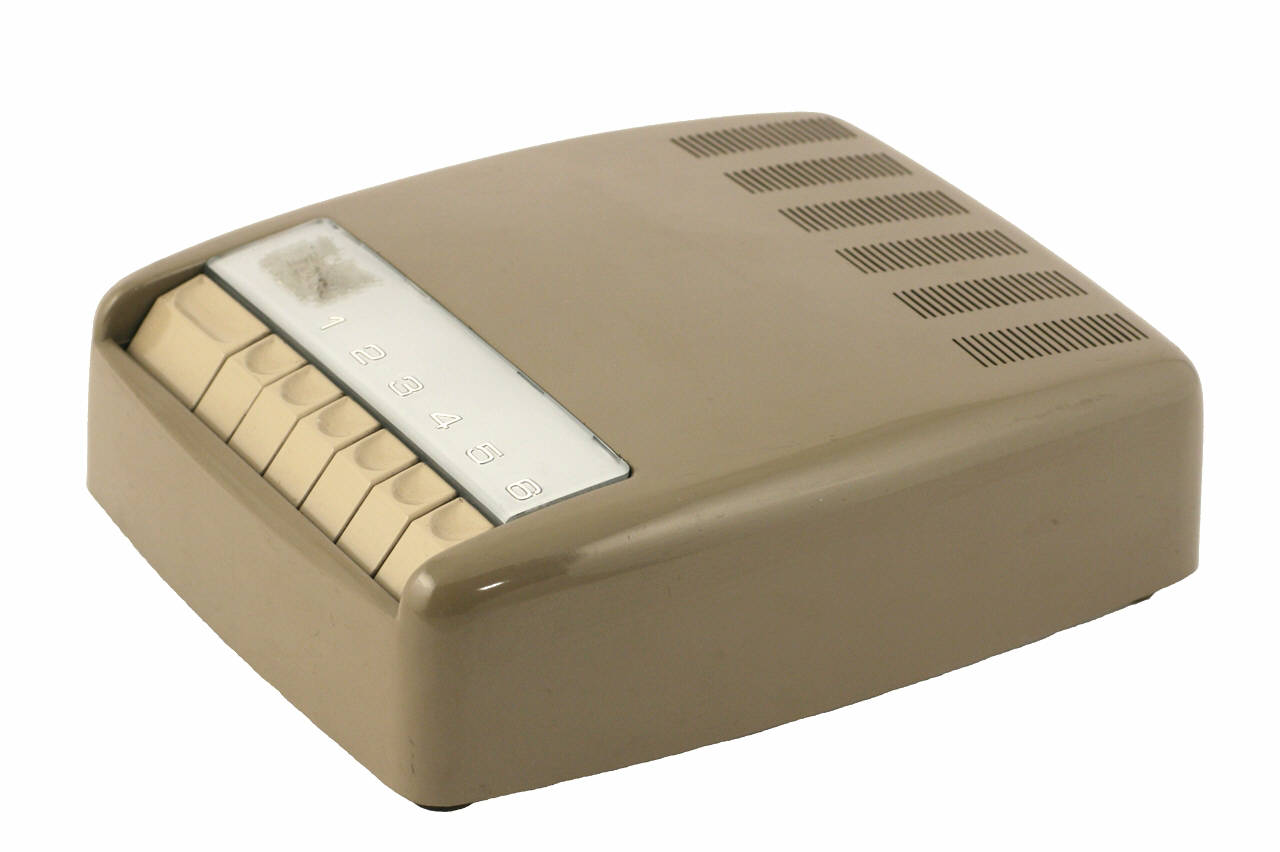 Apparecchio realizzato in materiale plastico color grigio a forma rettangolare con i margini e gli angoli arrotondati, poggiante su quattro piedini in gomma. Sulla superficie superiore sono posti i sette tasti ergonomici in plastica bianca. Sopra i tasti sono posti a rilievo dei numeri di colore rosso che vanno dal "1" al "6. Nella parte superiore della superficie superiore vi sono delle fessure per l'aerazione.\nAll'interno è presente il circuito elettrico con due valvole ECH81-EF89, un diodo a cristallo e un raddrizzatore metallico.