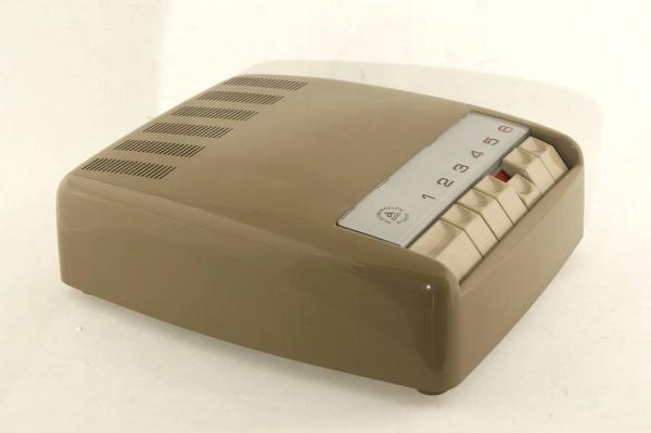 Apparecchio realizzato in materiale plastico color grigio a forma rettangolare con i margini e gli angoli arrotondati, poggiante su quattro piedini in gomma. Sulla superficie superiore sono posti i sette tasti ergonomici in plastica bianca. Sopra i tasti sono posti a rilievo dei numeri di colore rosso che vanno dal "1" al "6. Nella parte superiore della superficie superiore vi sono delle fessure per l'aerazione.\nAll'interno è presente il circuito elettrico con due valvole ECH81-EF89, un diodo a cristallo e un raddrizzatore metallico.