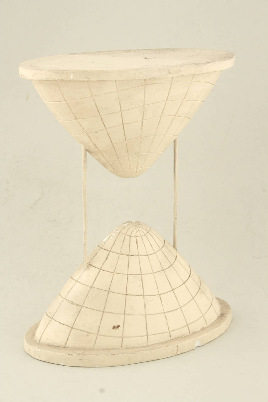 Il modello, una forma sagomata in gesso bianco, rappresenta una superficie luogo di punti dello spazio le cui coordinate soddisfano un¿equazione di secondo grado, in tre variabili (cioè "quadrica"), le cui sezioni parallele all'asse trasverso sono delle iperboli (da qui il nome di iperboloide), mentre quelle perpendicolari ad esso sono delle ellissi che iniziano a partire da una certa distanza dal centro e di dimensioni simmetriche e crescenti rispetto ad esso (da qui a due falde).\nLa superficie del modello, detta anche mantello, presenta dei solchi regolari, tracce di alcune delle iperboli e delle ellissi componenti la superficie geometrica.