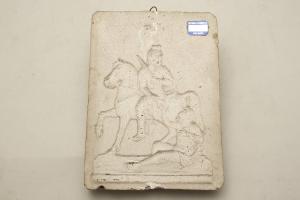 Forma in gesso con riprodotta un'immagine in negativo. Questa forma è contenuta con altre in gesso e in legno in una bacheca chiusa da un vetro.
