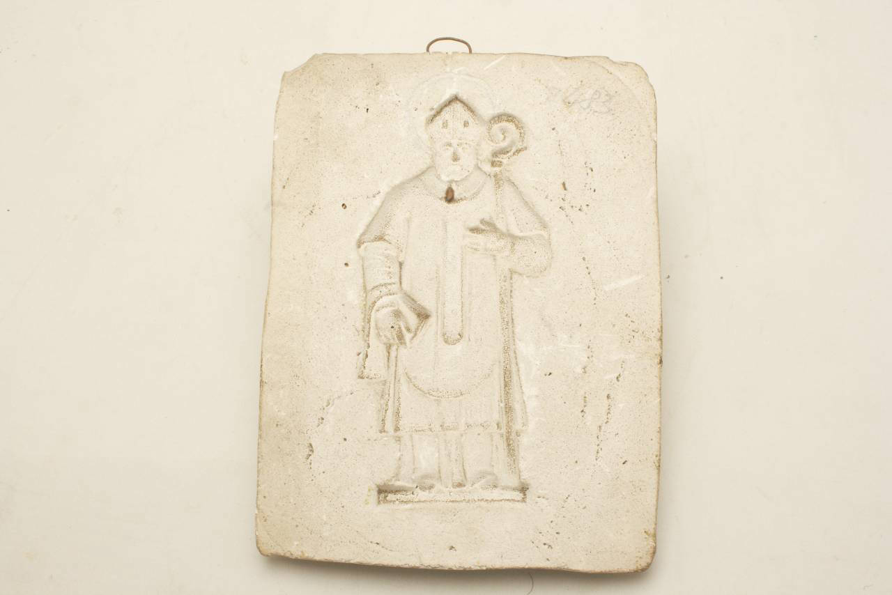 Forma in gesso con riprodotta un'immagine in negativo. Questa forma è contenuta con altre in gesso e in legno in una bacheca chiusa da un vetro.