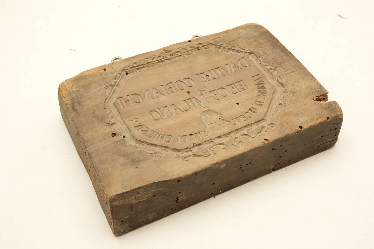 Forma in legno con riprodotta su un lato la scritta "LUIGI BOZZI FECE" con il disegno di una campana e alcuni motivi floreali, sull'altro lato la scritta "DAVIDE COBIANCHI FECE MILANO FABRIC. D'OCET-TI DI CHIESA" con il disegno di una campana e motivi floreali. Le scritte sono a rovescio. Questa forma è contenuta con altre in gesso e in legno in una bacheca chiusa da un vetro.
