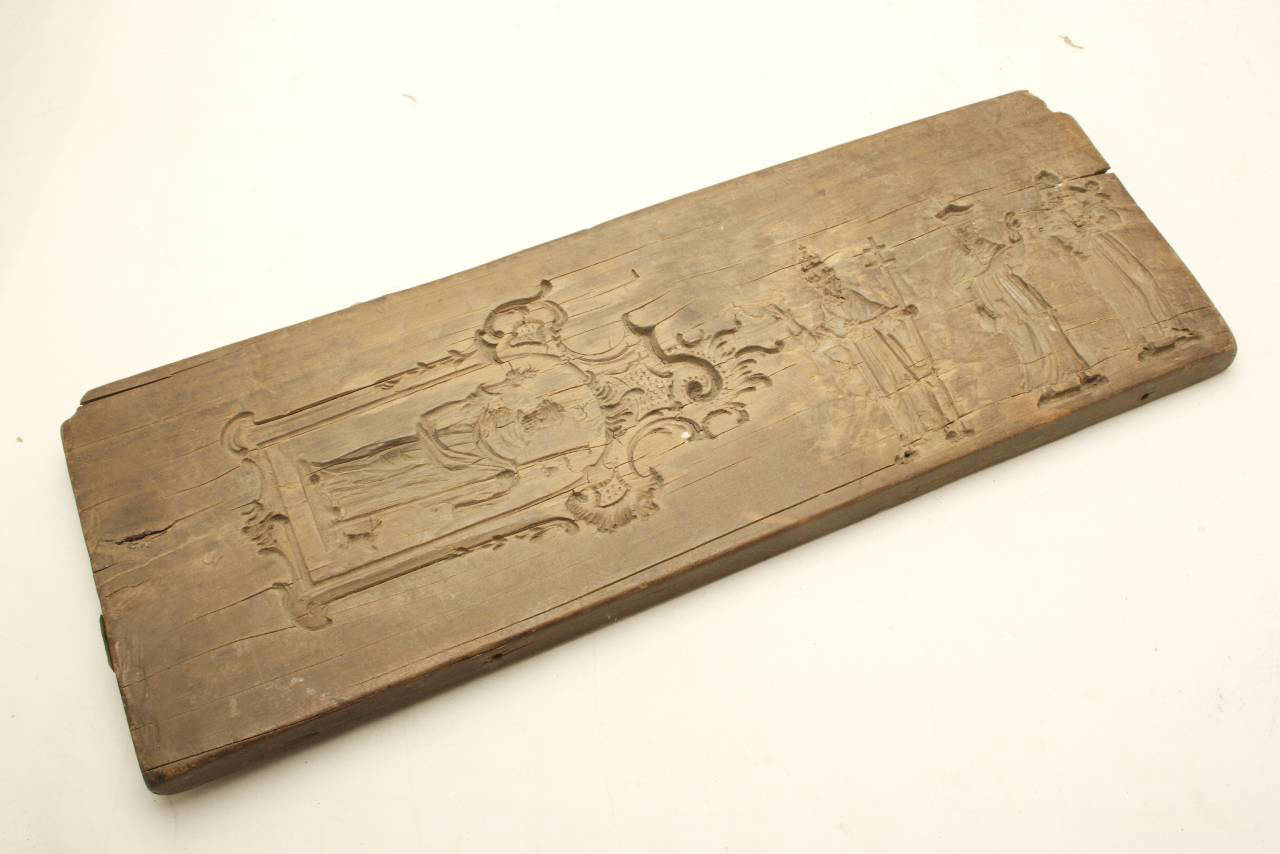 Forma in legno con riprodotte alcune figure ecclesiastiche e alcuni fregi a motivo floreale. Questa forma è contenuta con altre in gesso e in legno in una bacheca chiusa da un vetro.
