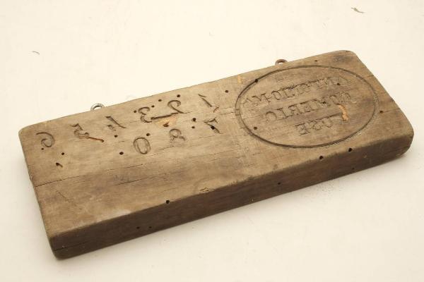 Forma in legno con riprodotta su un lato la scritta "ANTONIO COMERIO FUSE" con le cifre 1, 2 , 3, 4, 5, 6, 7,8 ,0, sull'altro lato le lettere dell'alfabeto dalla A alla Z e due mani che indicano in direzioni opposte. Le scritte sono a rovescio. Questa forma è contenuta con altre in gesso e in legno in una bacheca chiusa da un vetro.