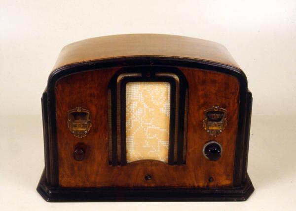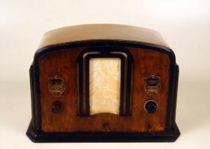Radioricevitore da tavolo a sviluppo orizzontale in legno e radica in parte verniciato di nero. \nAl centro della parete frontale è posizionato l'altoparlante protetto da un tessuto. Ai lati dell'altoparlante si ahnno, da un lato, la manopola per la regolazione del volume e il selettore per le gamme d'onda (manca la manopola). A destra si hanno il dispositivo per la sintonia (manca la manopola) e la scala di sintonia con indicazioni numeriche da 0 a 100.\nAl centro, in basso, l'interruttore di accensione.\nIl retro è aperto e sono visibili il circuito a valvole e l'altoparlante circolare.