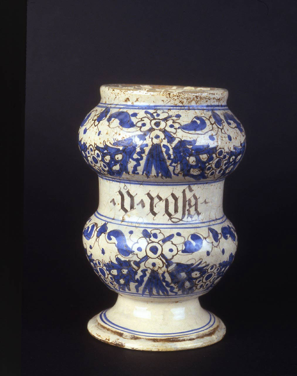 Vaso a rocchetto, forma comunemente denominata albarello, con orlo cilindrico poco aggettante che si diparte da spalla molto arrotondata. Fascia centrale poco alta. Alto piede piano ad anello.