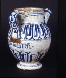 Vaso a corpo globulare su alto piede piano ed espanso, comunemente denominato orciolo. Collo cilindrico da cui si diparte, appena sotto l'orlo, una larga ansa nastriforme che scende fino a sotto la spalla. Larga apertura con orlo estroflesso. Dalla spalla si diparte un beccuccio a cannello cilindrico, chiuso da un tappo di sughero.