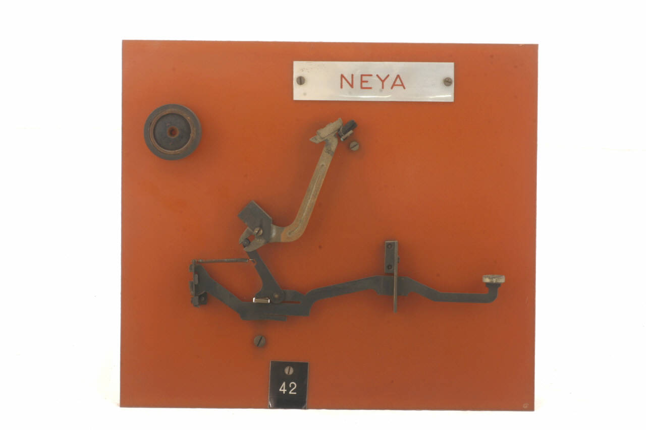 Cinematismo costituito da tre elementi in acciaio. La leva curva del tasto è incernierata ad una leva centrale che fa da tirante al martelletto portacaratteri (i caratteri riportati sono: "Ü", "Ü" e "^"). Il bottone del tasto è in celluloide trasparente su sfondo nero riportante i caratteri segnati in bianco: "Ü", "Ü" e " ^ ". Il movimento di ritorno del tasto è guidato dalla molla a torsione agente sul braccio più lungo della leva centrale. Il cinematismo è fissato ad un pannello in bachelite.