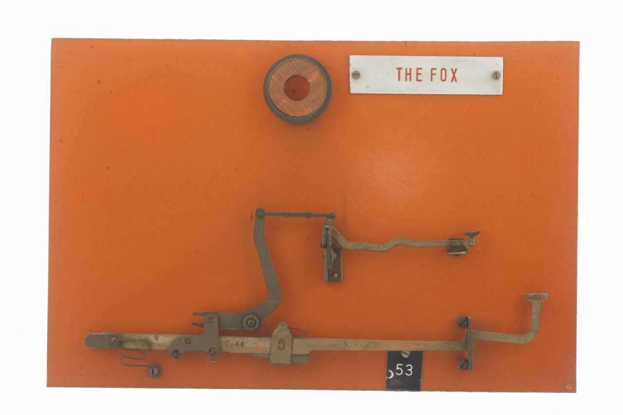 Cinematismo costituito da tre elementi principali in acciaio. La leva del tasto agisce tramite una cerniera su una leva centrale che a sua volta, tramite un tirante, fa scattare la leva del martelletto portacaratteri (i caratteri riportati sono: "ä" e "§"). Il bottone del tasto è in celluloide trasparente su sfondo bianco riportante i caratteri "ä" e "§". Il movimento di ritorno del tasto è guidato dalla molla agente sulla leva del tasto. Il cinematismo è fissato ad un pannello in bachelite