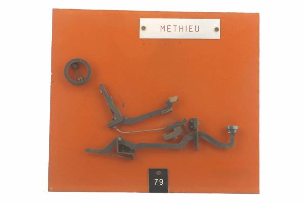 Cinematismo costituito da tre elementi principali in acciaio. La leva sagomata del tasto è collegata tramite un tirante ad una leva centrale che, tramite un altro tirante, agisce sulla leva del martelletto portacaratteri riportante due caratteri. Il bottone del tasto è in plastica verde e riporta inciso in bianco il carattere "C". Il movimento di ritorno del tasto è guidato da una molla a lamina che agisce direttamente sulla leva del martelletto portacaratteri ed è aiutato dalla molla a torsione agente sulla leva del tasto. Il cinematismo è fissato ad un pannello in bachelite.