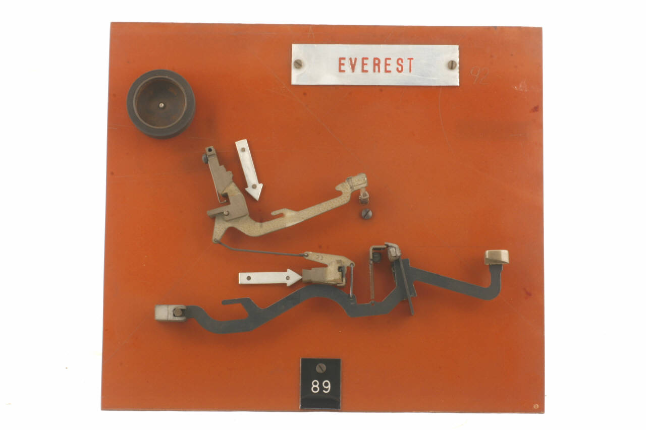 Cinematismo costituito da tre elementi principali in acciaio. La leva sagomata del tasto agisce, tramite una leva centrale che fa da tirante, sulla leva del martelletto portacaratteri (i caratteri riportati sono: "H" e "h"). Le articolazioni tra le leve consistono in cerniere cui sono collegati due tiranti agenti in trazione, orizzontale l'uno e verticale l'altro. Il bottone del tasto è in plastica grigio-verde riportante in bianco il carattere "H". Il movimento di ritorno del tasto è guidato da una molla che agisce direttamente sulla leva del martelletto portacaratteri ed è aiutato dalla molla a torsione agente sulla leva del tasto. Il cinematismo è fissato ad un pannello in bachelite; sul fronte dello stesso pannello sono fissate due frecce in alluminio affiancate ai supporti dei rimandi.\nSul retro del pannello sono fissati due altri tiranti come esempio di coppia di tirante orizzontale e verticale relativi alla leva n° 45; inoltre sono fissati sul retro del pannello anche quattro esempi di differenti leve centrali (o rimandi).