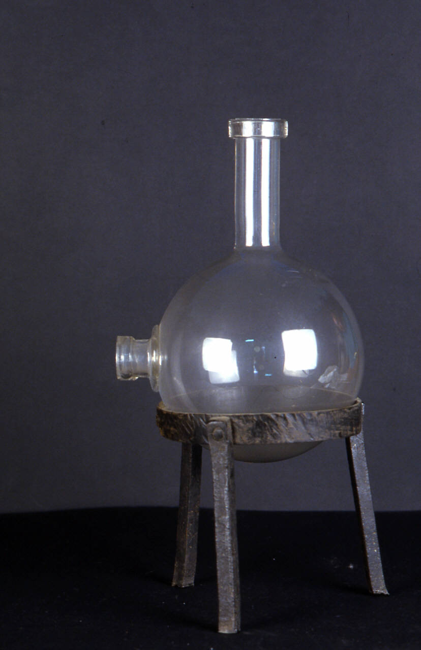 Recipiente in vetro con base sferica e due colli cilindrici con bordo fortemente distinto; il collo più lungo si diparte superiormente, mentre quello più corto è posto lateralmente, a 90° rispetto al primo. Il collo più corto presenta un apporto di materiale vitreo, come di saldatura, sulla zona di contatto con la base sferica.\nA sorreggere il pallone c'è un sostegno in ferro battuto a tre piedi uniti per chiodatura ad un cerchio.