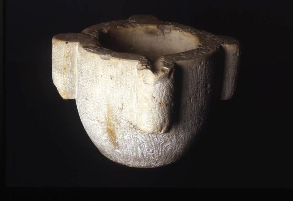 L'oggetto in pietra martellata, di forma emisferica cava, presenta quattro prese cilindriche equidistanti, delle quali una con la sommita forata da un beccuccio.