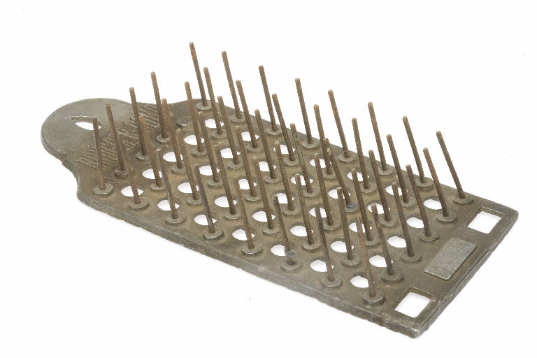 L'oggetto è formato da una piastra fusa in cui sono stati infissi dei perni metallici sporgenti (in 8 file da 6). Nella parte alta è presente, in fusione, il nome del produttore "BRUGGER COMO", in basso in un apposito riquadro è stato punzonato il numero seriale "143"