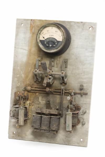 L'oggetto è costituito da un pannello isolante in pietra su cui sono collegati: un amperometro (che misura l'assorbimento di corrente e un interruttore magnetotermico con rudimentale dispositivo elettromeccanico di sgancio in caso di cortocircuito o sovracorrente