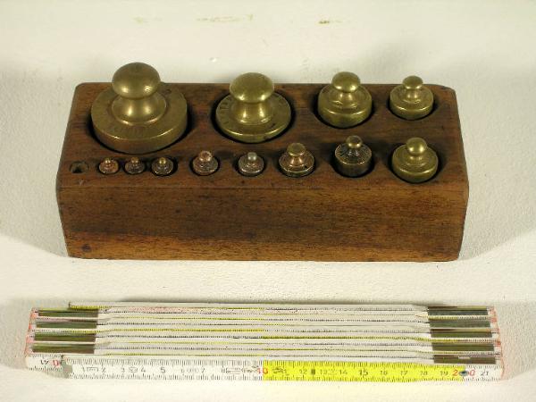 L'oggetto è costituito da un corpo di legno con alloggiamenti appositi per ospitare 11 pesini (presenti) in ottone, riempiti di piombo.