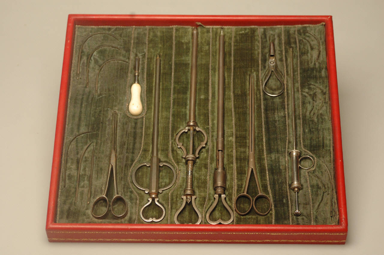 Cassetta rivestita di pelle rossa con decorazioni in oro, priva di coperchio e foderata di velluto verde al cui interno sono posizionati vari strumenti chirurgici utilizzati per il trattamento delle ferite.