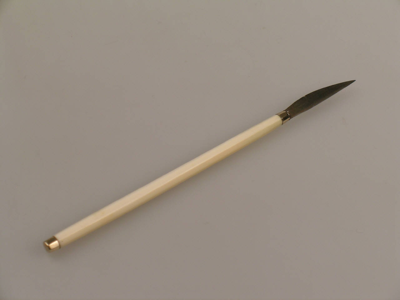 Su una lunga impugnatura di avorio a sezione ottagonale, decorata alle due estremità con sottili fascette di ottone, è fissata una lama appuntita e tagliente lungo il lato convesso. La fascetta di ottone accanto alla lama ha probabilmente la funzione di rafforzare il manico nel punto di innesto della lama stessa.