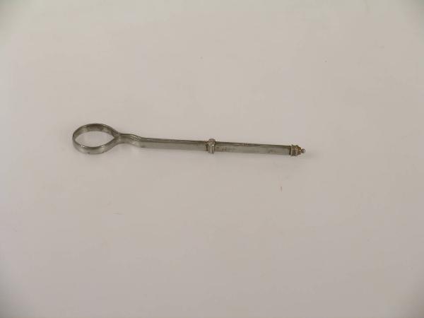 Due barrette metalliche, unite ad una estremità, sono accostate e parallele lungo il tratto dello strumento che ne costituisce l'impugnatura. Poi si allargano in due bracci ricurvi fino a formare un anello aperto all'estremità. Un anellino che avvolge le due barrette e può scorrere su di esse regola la loro posizione reciproca, permettendo di distanziarle o di avvicinarle.