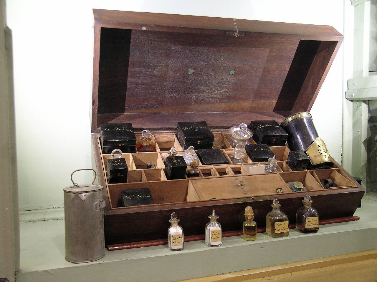 Una scatola parallelepipeda di legno è munita all'interno di trentadue piccoli scomparti nei quali sono alloggiate boccette di vetro, scatole metalliche e alcuni strumenti. Uno scomparto chiuso doveva contenere un tempo altri strumenti oggi mancanti. Sono presenti un fornellino con lampada ad alcol, due contenitori cilindrici con coperchio (inseriti l'uno nell'altro) e un contenitore a base quadrata munito di un manico a gancio. In una piccola scatola metallica è contenuto un laccio emostatico. \nBoccette di vetro con tappo a smeriglio e scatole di metallo verniciato contengono varie sostanze medicamentose. L'indicazione del contenuto si trova su etichette di carta per le boccette di vetro e incisa in lettere dorate sui coperchi delle scatole.\nLe boccette di vetro contengono: Oleum olivae, Tinctura cinamomi, Ammonia pura, Spir. cornu cervi, Oleum terebinti, Aether sulforicus, Fungi agarici chir., Herba arnica, Spiritus vini, Tartarus emeticus, Vitriolum zinci, Tinctura cantaridum.\nLe scatole contengono: Fol. nicotinae, Spec. emolientes, Spec. resolventes, Allume, Empl. vesicatorium, Empl. diachylon, Fol. sennae, Flos Chamomillae.\nLa scatola è unita di due gancetti laterali e di una serratura (la cui chiave è mancante).