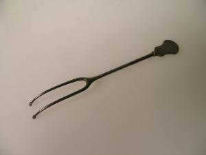 Due aghi, ricurvi, la cui punta termina in una piccolissima asola si innestano in un manico che termina in una placchetta sagomata.