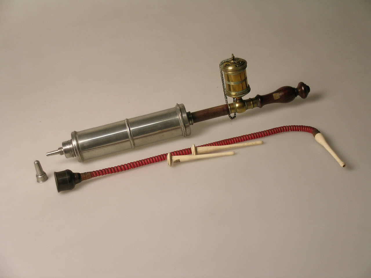 Si tratta di uno strumento composito e scomponibile in varie parti. Nel manico cavo di una siringa veniva avvitato un piccolo braciere cilindrico (infundibulum) nel quale veniva acceso il tabacco. Al beccuccio della siringa potevano essere applicate diverse cannule (generalmente in cuoio e dotate di una punta rigida di avorio).\nAll'interno dello strumento si trova un piccolo dispositivo, inserito prima della punta, costituito da una specie di valvola in cui il foro attraverso il quale deve passare il fumo è coperto in uscita da una linguetta di pelle che impediva al fumo di tornare indietro.