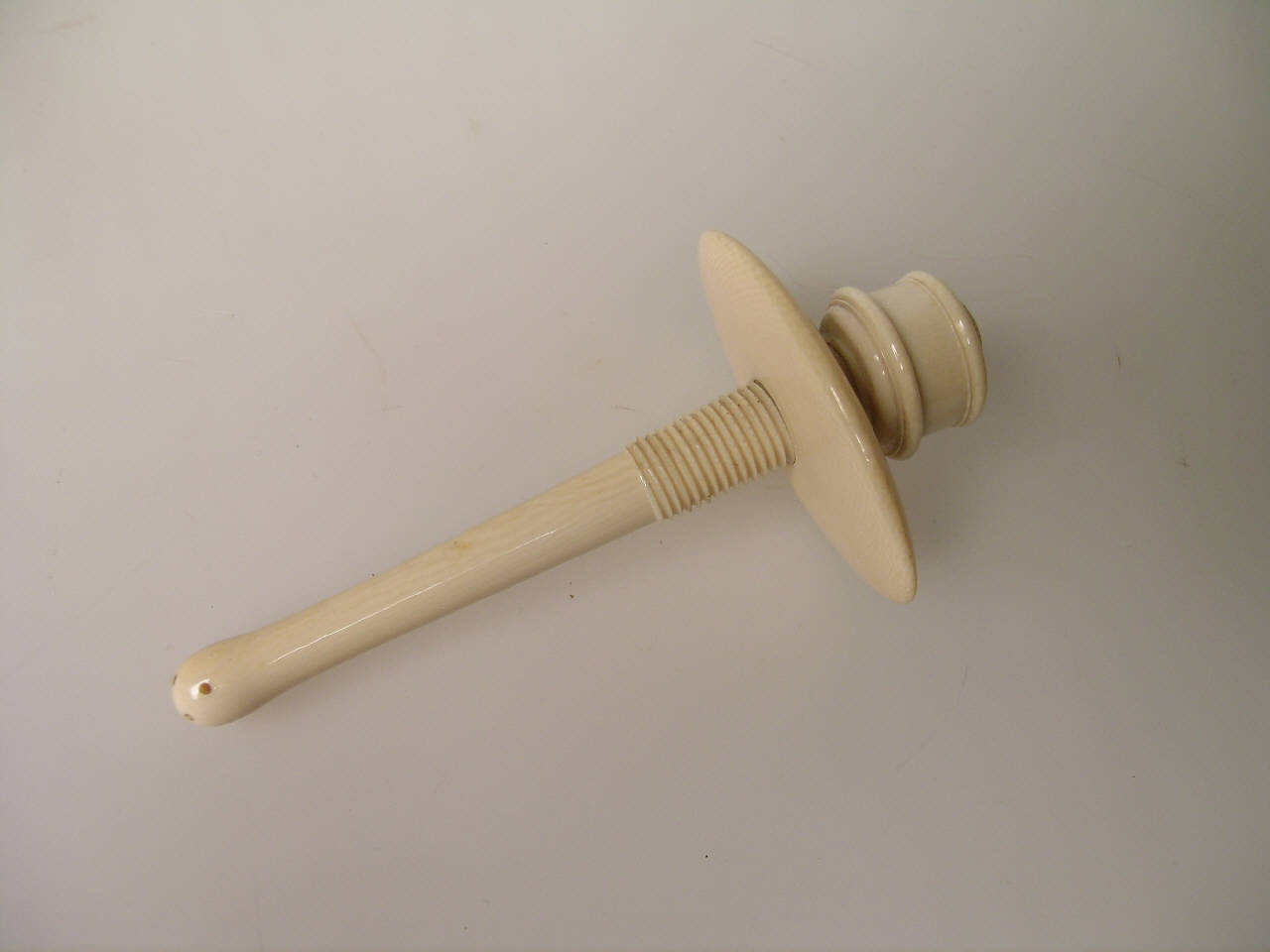 Cannula in avorio con punta rotondeggiante e dotata di fori. Sull'altra estremità è avvitato un coperchietto che permette di adattare e fissare la cannula stessa ad un vaso elastico o a una siringa. Un disco ovale forato al centro, che può scorrere lungo la filettatura della cannula permette di variarne la lunghezza