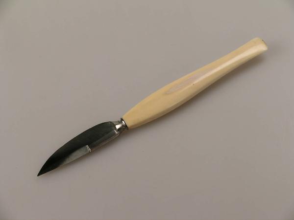Su un'impugnatura sagomata in avorio è montata una lama appuntita, convessa su uno dei lati e diritta sull'altro. Sono taglienti la parte convessa e circa la metà della parte dritta, che risulta invece ispessita nella parte non tagliente.
