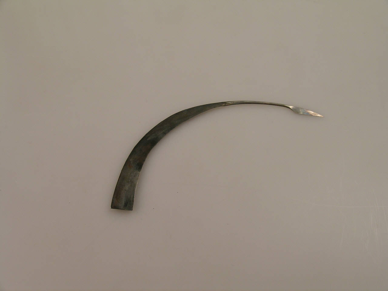 Lama ricurvain acciaio, tagliente lungo il lato concavo, dotata di un apice lancelolato.