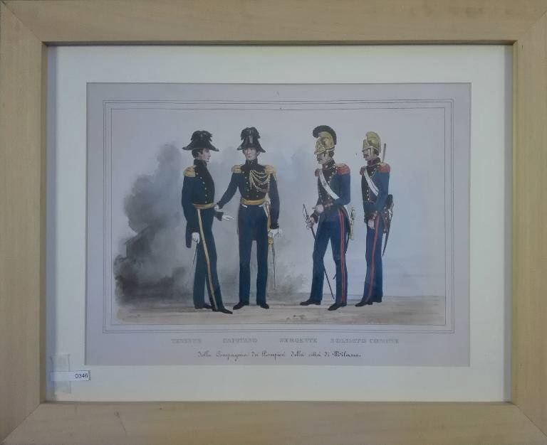 Quadro con stampa rappresentante un tenente un capitano un sergente e un soldato comune della compagnia dei Zappatori Pompieri della città di Milano.