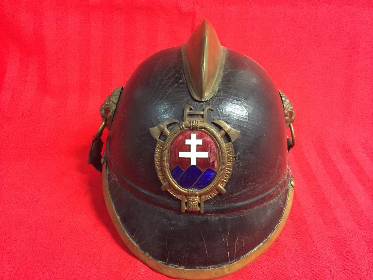 Elmo in cuoio, con stemma della Slovacchia (composto da una croce doppia, o croce patriarcale, bianca su sfondo rosso e che si erge al centro di uno di tre monti dal colore blu), all'interno di un ovale formato da una cornice di corde e idranti con scale e asce,con cresta e finiture in ottone. Sullo stemma compare la scritta "ZEMSKA HAS JEDN NA SLOVENSKU"\nIl modello è del tipo "Firenze", con marocchino in cuoio (parte interna che serve ad adattare l'elmo al capo), sottogola in cuoio, cresta in ottone, borchie con teste di leone e finitura della visiera e del coprinuca in ottone.
