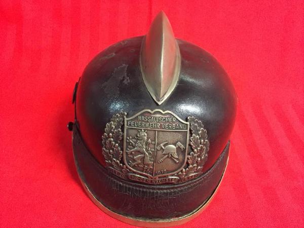 Elmo in cuoio, con stemma in metallo argentato formato da scudo partito in due, con leone rampante coronato da una parte ed elmo ed asce dall'altra,con attorno ghirlanda di quercia.Sullo stemma compare la scritta "NASSAVISCHER FEVERWEHR VERBAND GOTT ZUR EHR DEM NACHSTEN ZUR WEHR"\nIl modello è compatto, con marocchino in cuoio (parte interna che serve ad adattare l'elmo al capo), cresta in lamiera, borchie semplici e finitura della visiera e del coprinuca in lamiera.\nAll'interno, sulla parte in cuoio, vi è un timbro "AKT 1918"