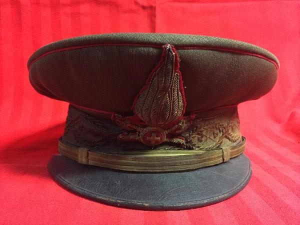 Berretto da ufficiale in sallia, per divisa. Bordatura del cappello e dello stemma in rosso,stemma ricamato in oro, greca ricamata sul bordo, soggolo in sottile striscia di ottone foderata di cuoio con piccoli bottoni in ottone dorato,visiera in cuoio,
