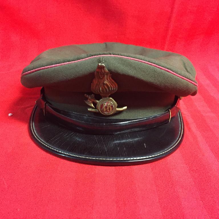 Berretto in sallia bordato in rosso, con visiera e soggolo in cuoio nero lucido, stemma in ottone dorato con "48" (Mantova), bottoncini in ottone dorato ai bordi del soggolo, fascia interna in cuoio, fodera in raso